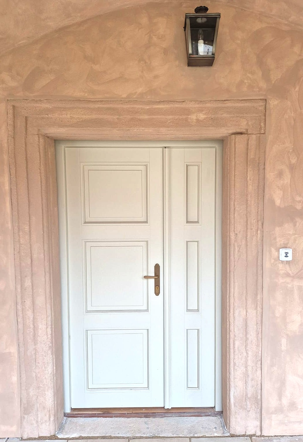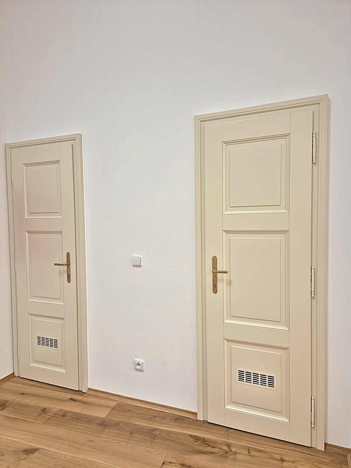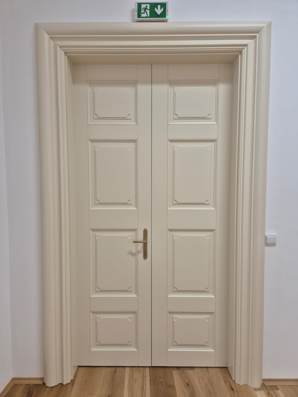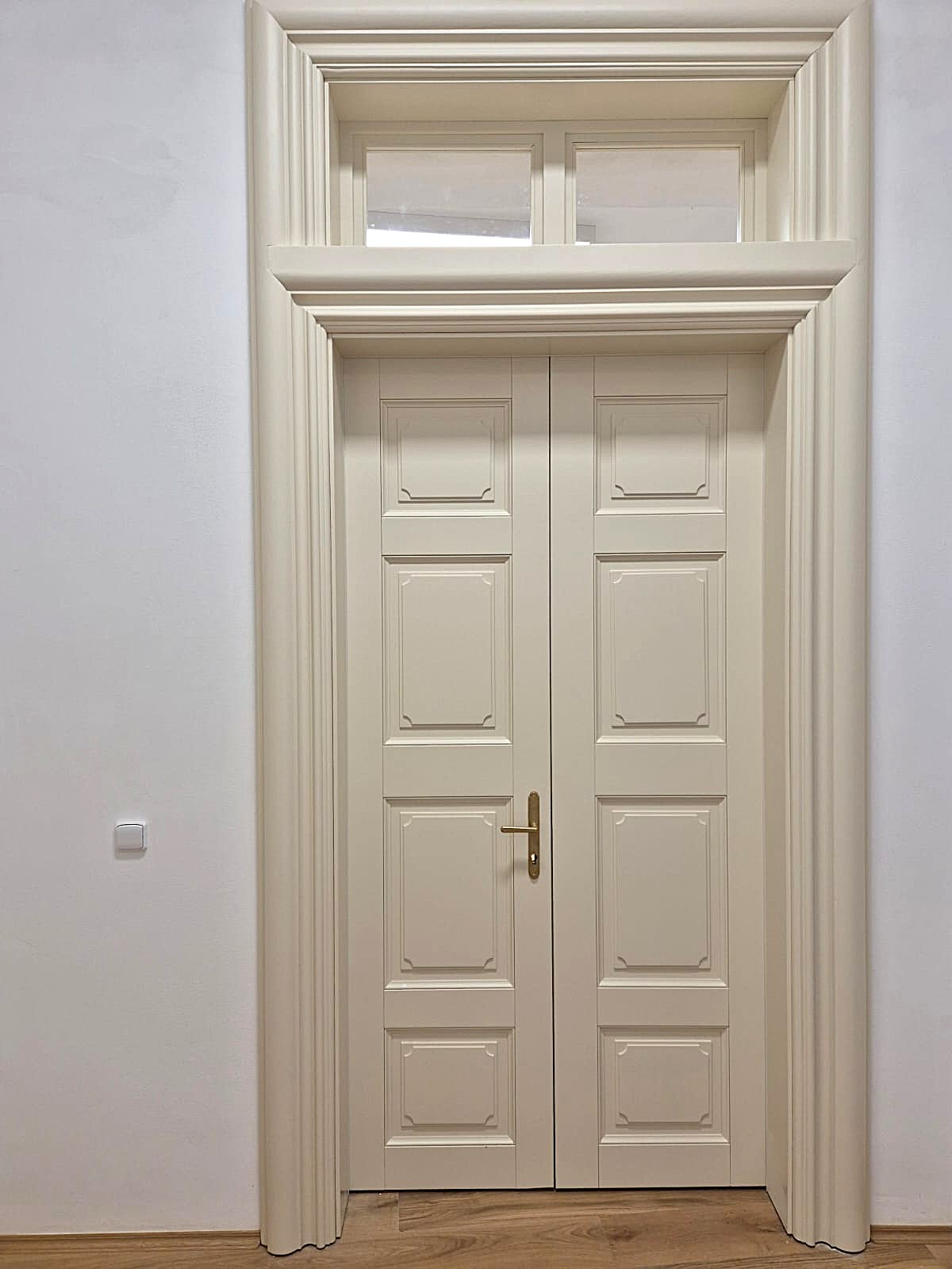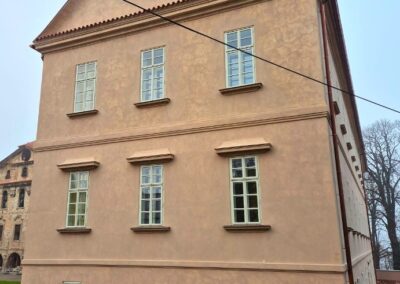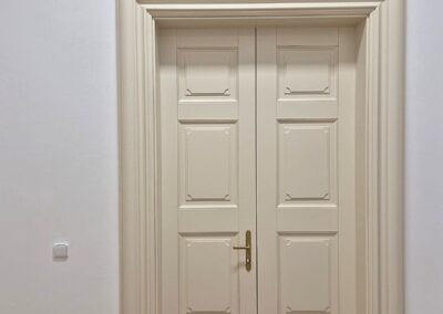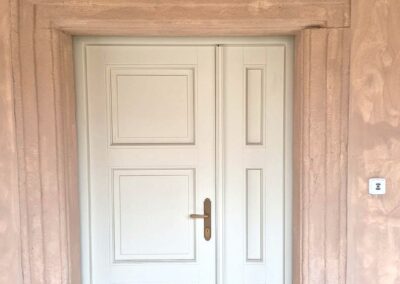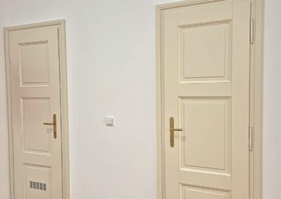 Tento zámek jsme obohatili o vnitřní kazetové dveře z masivního dřeva, jež se pyšní nejen svým elegantním vzhledem, ale i protipožární odolností EI30/EW30, doplněné o exteriérové dveře.